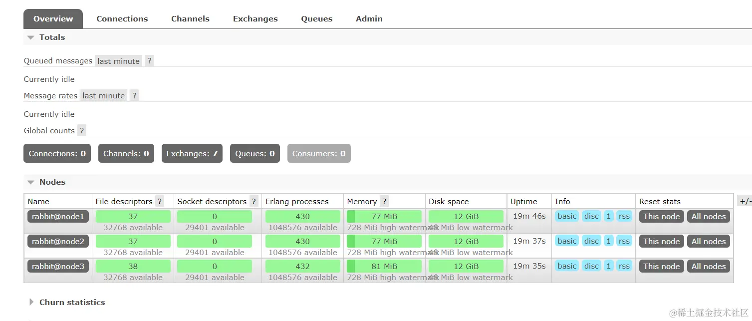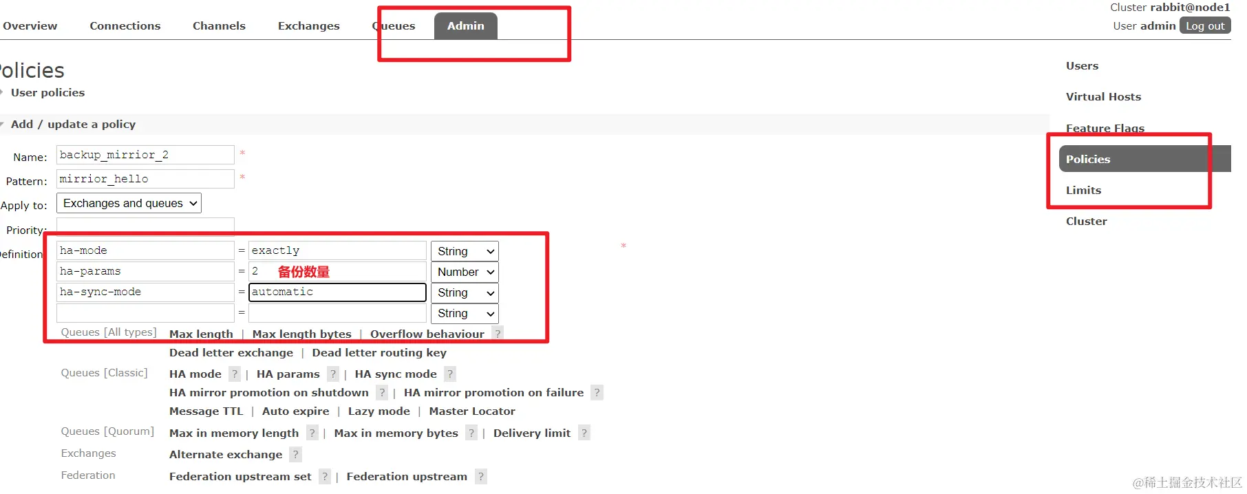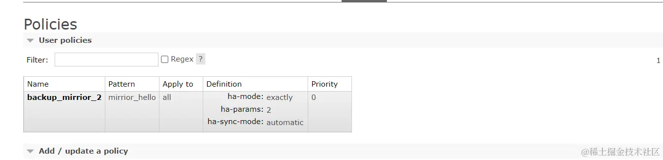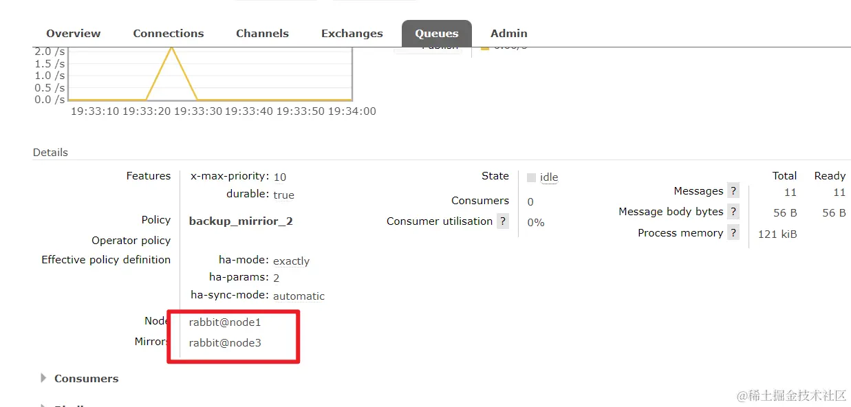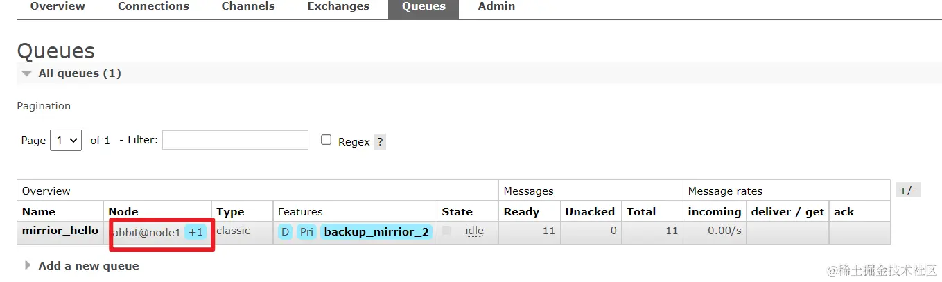 也就是说,搭建完集群之后在一个节点上创建一个队列,在集群中另外的节点中是有显示,但是如果创建队列的节点宕机,集群中的其他的节点就无法进行访问了,所以使用镜像可以做备份,发消息的时候不能只是发到 1 号节点,1 号节点应该将内容备份到其他的节点上,方式消息丢失。