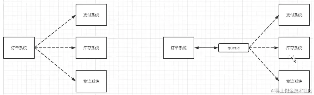 MQ(message queue),本质是个队列,FIFO 先入先出,只不过队列中存放的内容是message,还是一种跨进程的通信机制,用于上下游传递消息。互联网架构中,MQ 是一种非常常见的上下游“逻辑解耦 + 物理解耦” 的消息通信服务。使用 MQ 之后,消息发送上游只需要依赖 MQ,不用依赖其他服务。
