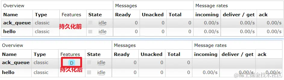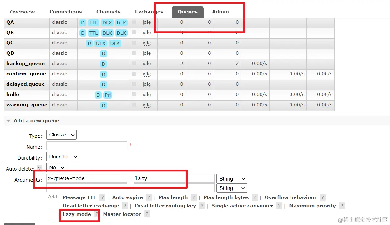 惰性队列:消息保存在内存中还是在磁盘上,正常情况下保存在内存中的,但是惰性队列情况下是保存在磁盘中的。