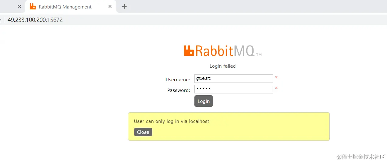 使用默认账号密码(guest) 访问 ip地址:15672 会出现一个权限不够的问题