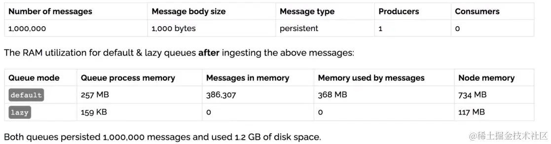 发送一百万条数据,每条消息大概占 1kb 的情况下,普通队列占用内存是 1.2GB,而惰性队列仅仅占用 1.5MB(消息都放到磁盘了,内存中保存了索引)。