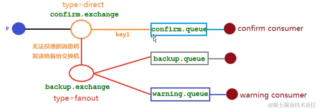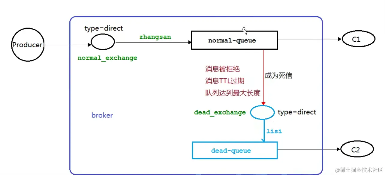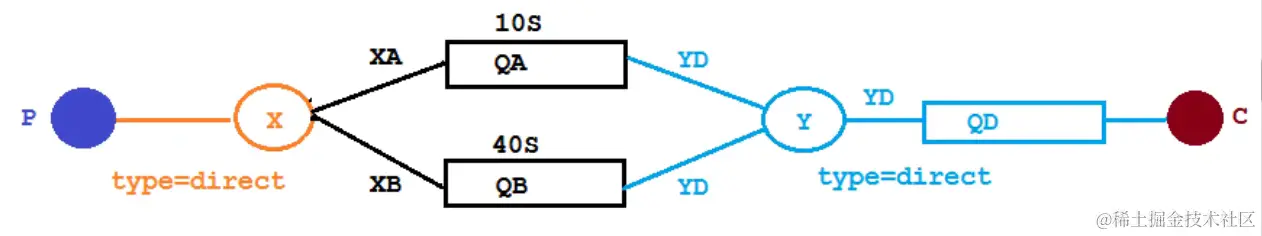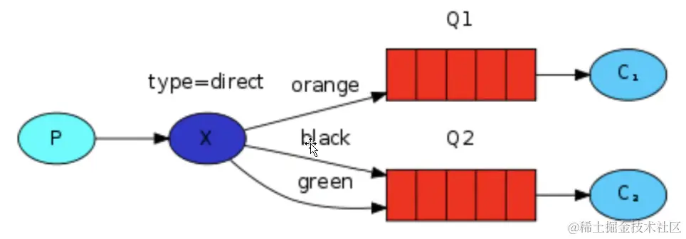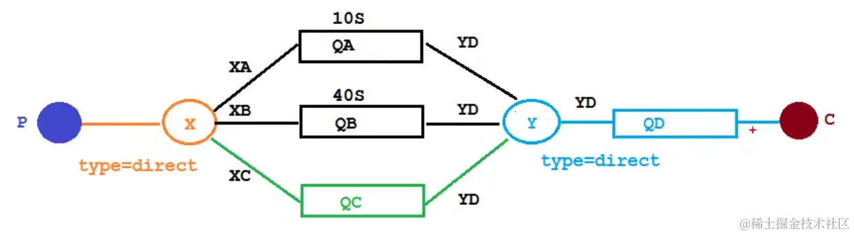 - 在源头发送的消息直接会进入到目的地队列