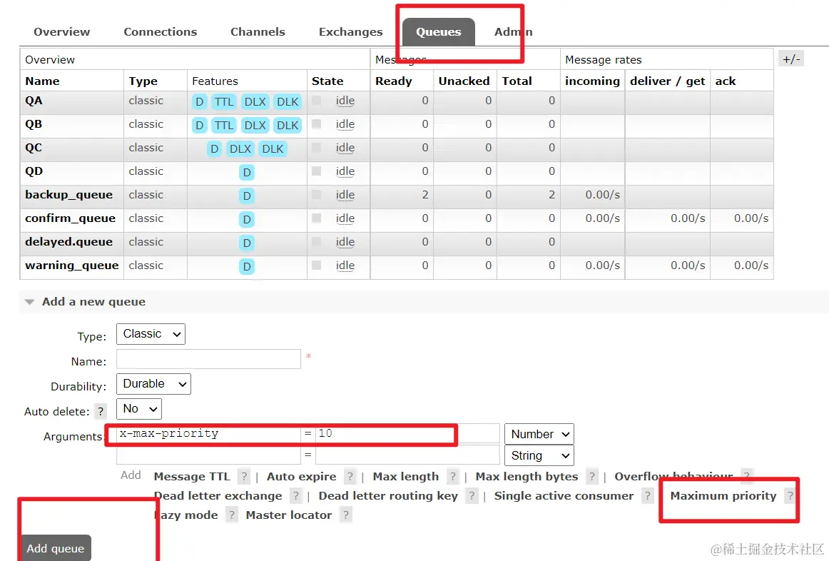 channel.queueDeclare("myqueue", false, false, false, arguments);