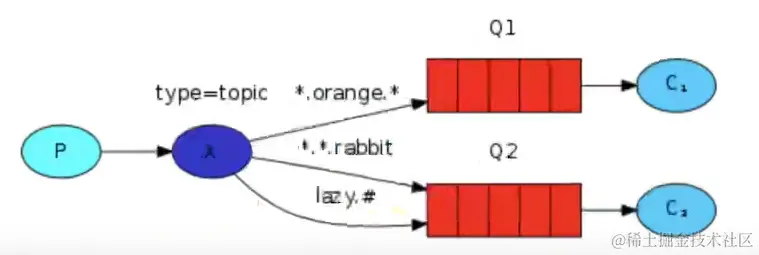 - Exchange:message 达到 broker 的第一站,根据分发规则,匹配查询表中的 routing key,分发消息到 queue 中去。常用的类型有:direct(point-to-point),topic(publish-subscribe) and fanout(multicast)
