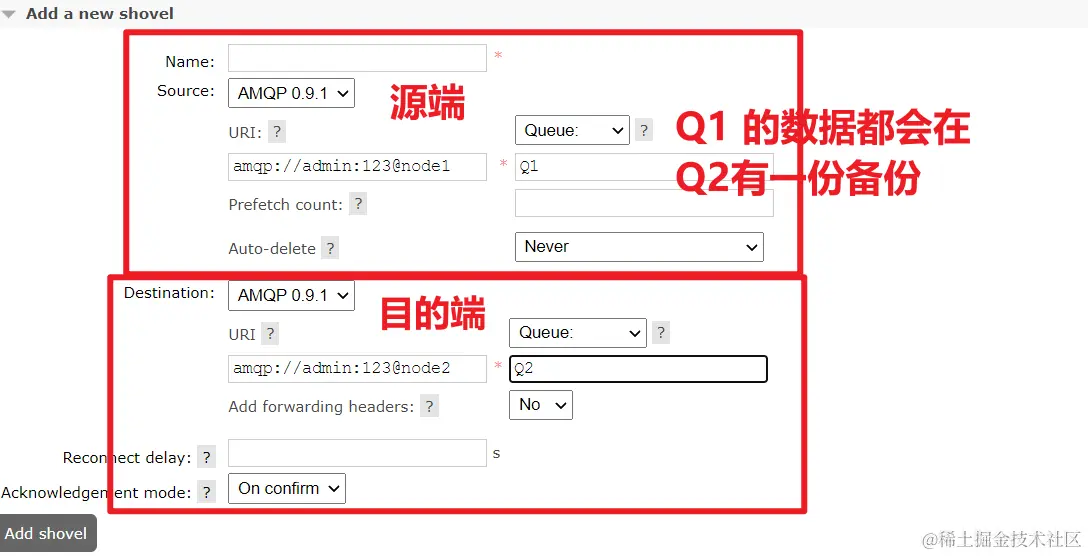 与Federation 具备的数据转发功能类似,Shovel 更可靠、持续地从一个 Broker 中的队列(作为源端,即source)拉取数据并转发至另一个 Broker 中的交换器(作为目的端,即 destination)。作为源端的队列和作为目的端的交换器可以同时位于同一个 Broker,也可以位于不同的 Broker 上。Shovel 可以翻译为 ”钉子“,是一种比较形象的比喻,这个”铲子“可以将消息从一方”铲到“另一方。Shovel 行为就像优秀的客户端应用程序能够负责连接源和目的地、负责消息的读写及负责连接失败问题的处理。