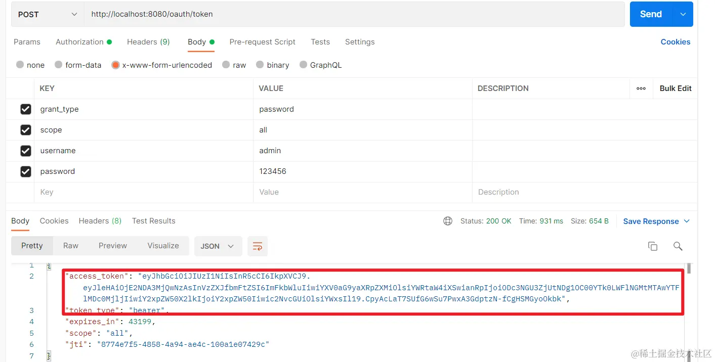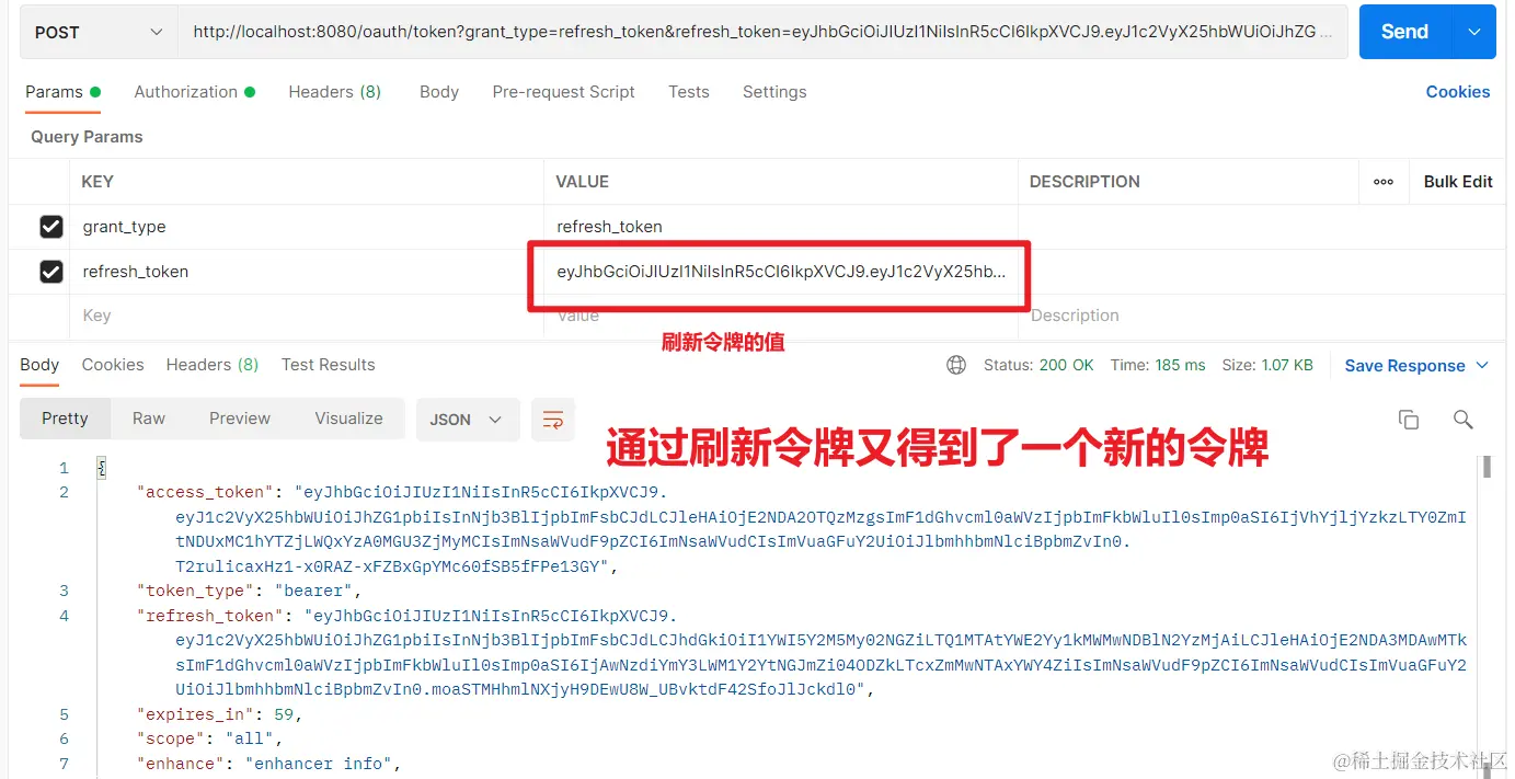 然后通过设置参数和上面得到的刷新令牌进行访问就可以得到新的令牌了