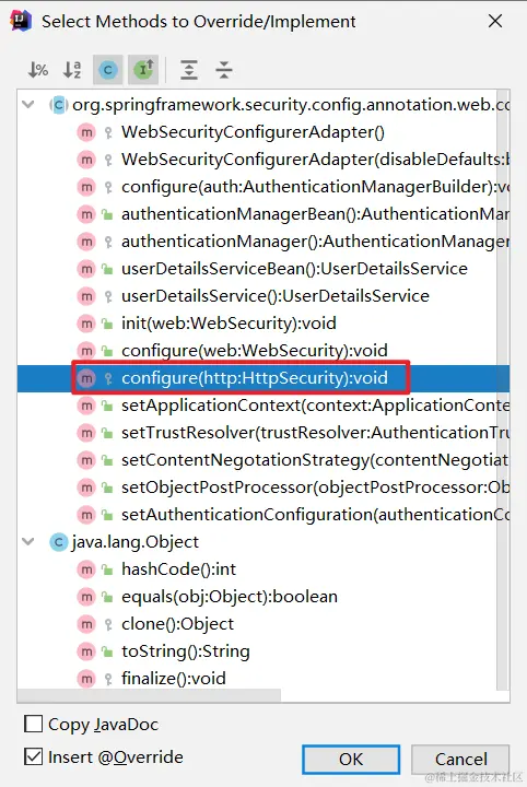 - SpringSecurityConfig 继承 WebSecurityConfigurerAdapter 类,实现 configure 方法