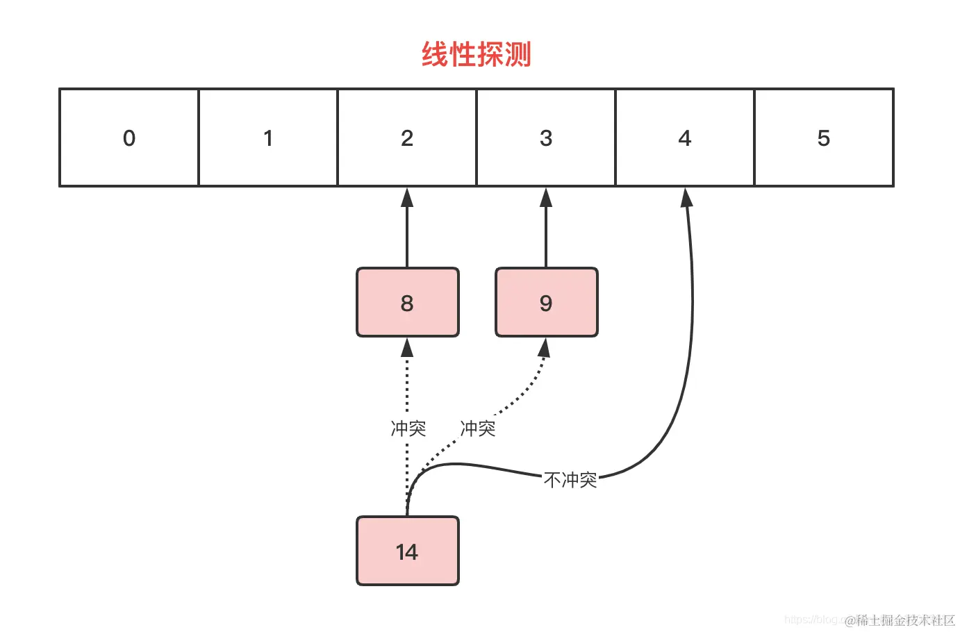 线性探测会环形寻找next节点,先找到下标3,被9占用了,依然冲突,再找到下标4,没有被占用,即没有发生冲突,则将14放入下标4的节点中。