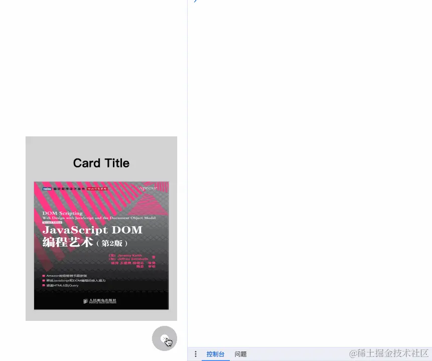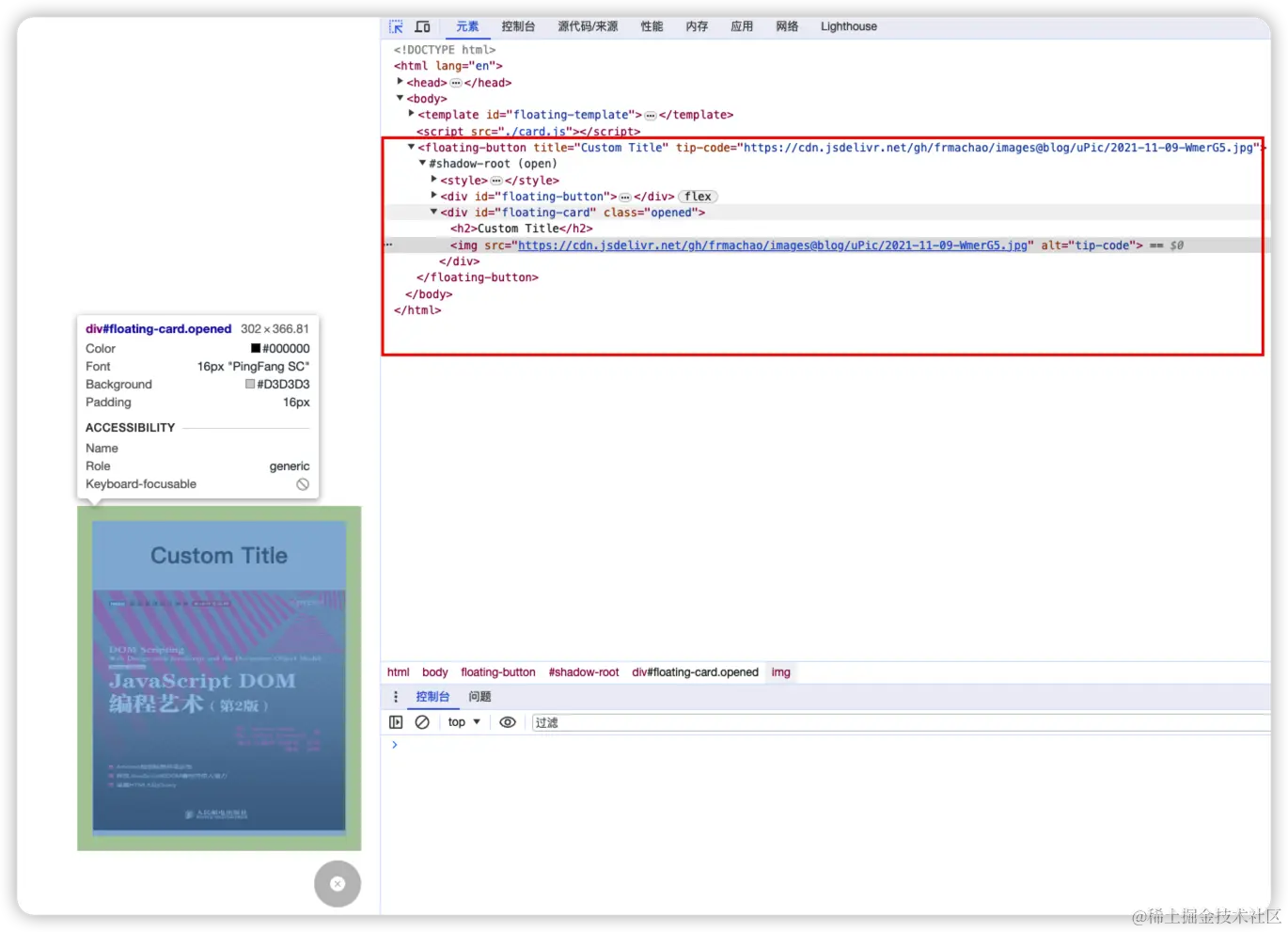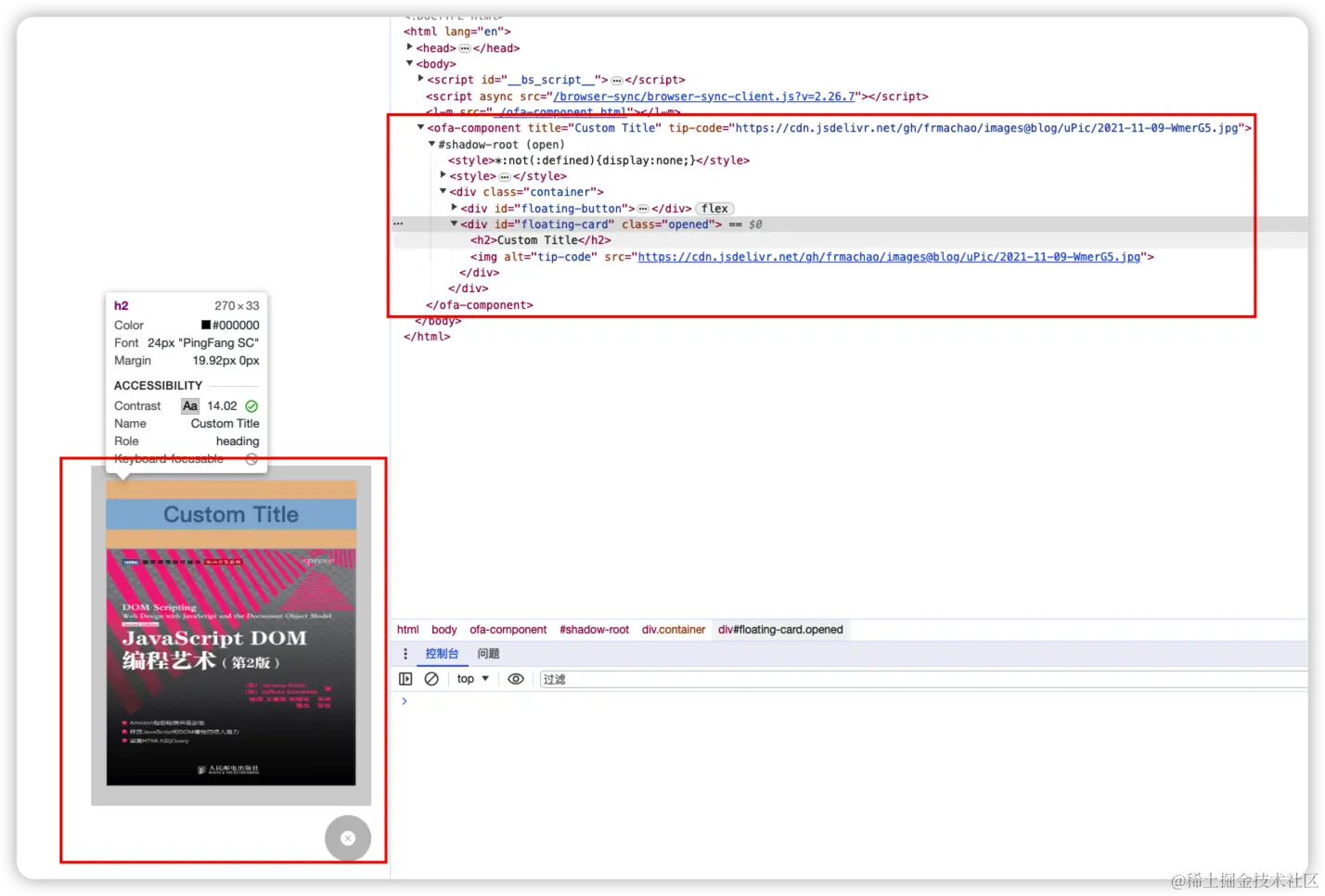 在浏览器中打开 component-demo.html,可以看到我们定义的 floating-button 已经被正确的渲染出来,审查元素可以看到组件是一个 Shadow DOM 中。