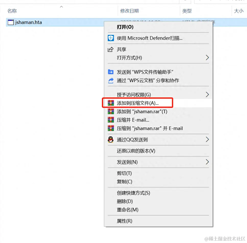 这时要使用winrar,把刚刚创建的jshaman.hta添加到压缩文件: