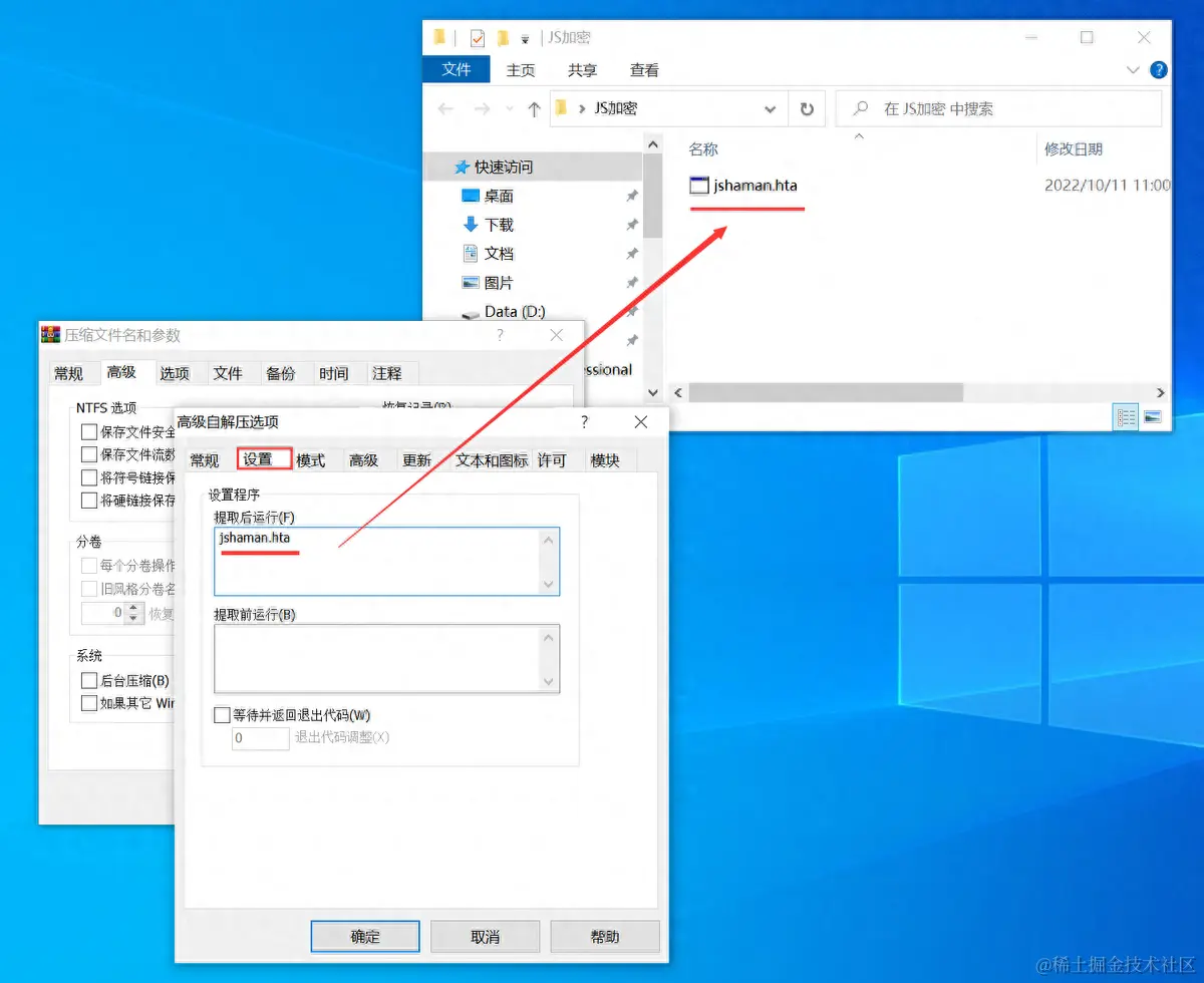在“自解压选项”的“设置”中,设置“提取后运行”为:jshaman.hta,即刚刚创新建的hta文件。