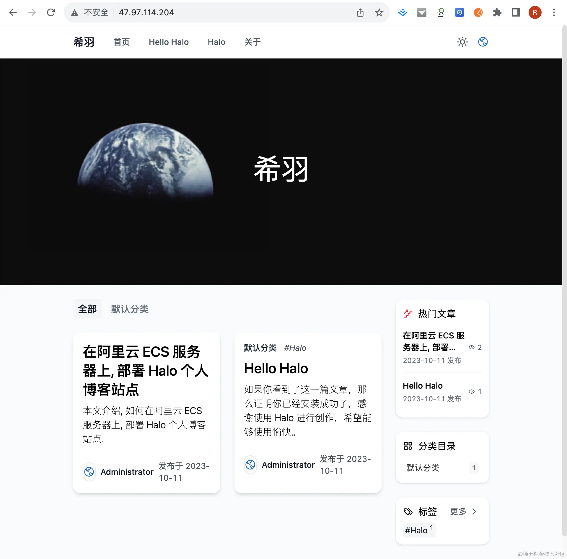 最后,点击确认按钮,即可完成安装。 为了能访问这个博客站点,需要开发服务器的 8080 端口,参见前文。 这里介绍另一种方案,通过 Nginx 反向代理的方式。