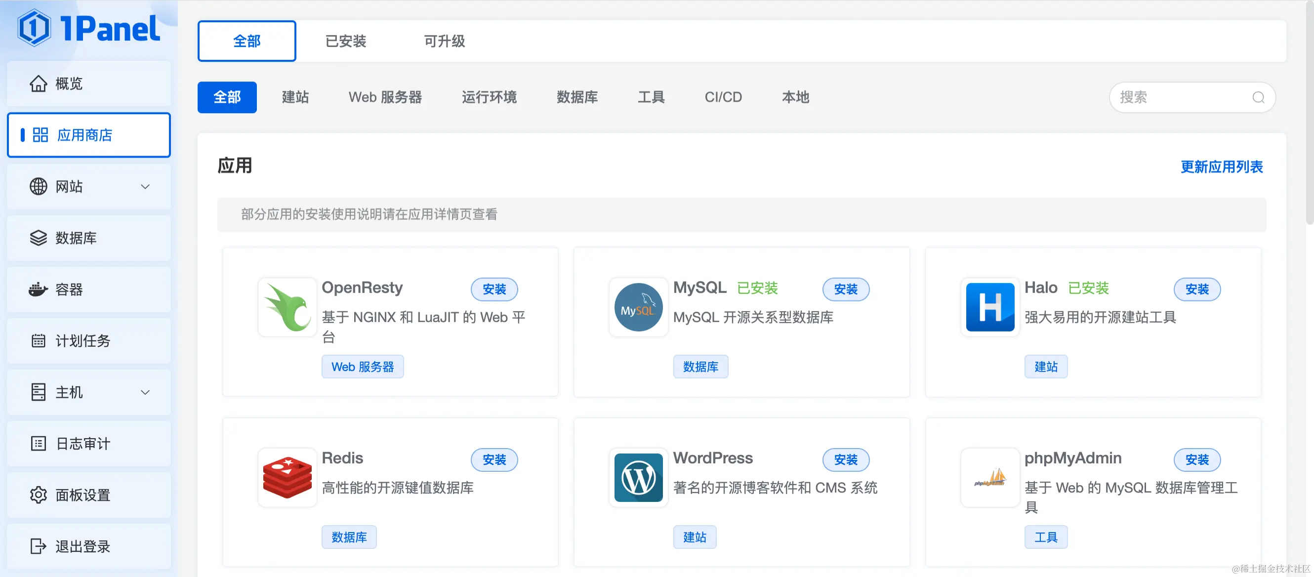 在 1Panel 的应用商店->全部, 选择安装 MySQL. 我这里已安装,已有安装的标识。