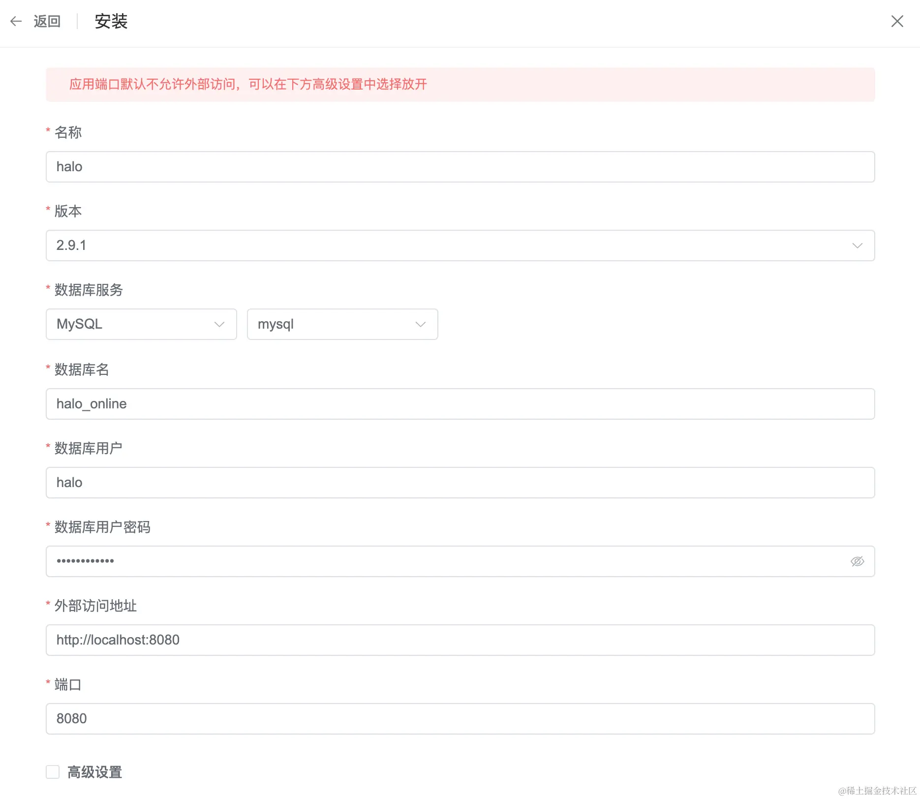 Halo, 强大易用的开源建站工具,这里将它作为个人博客站点。 同安装 MySQL 一样,点击安装 Halo, 简单配置访问数据库的用户和密码信息即可。