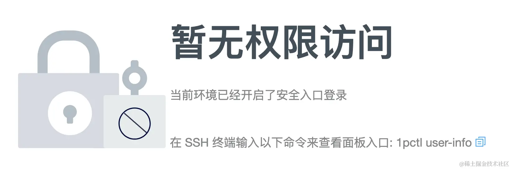 安装过程,基本选择默认方式,只手动设定了登录密码。 默认安装的端口号是 37590, 参照获取免费云服务器 中介绍的,开的 37590 端口号; 但通过 http://47.97.114.204:37590 访问,缺显示暂无权限,如下图所示。