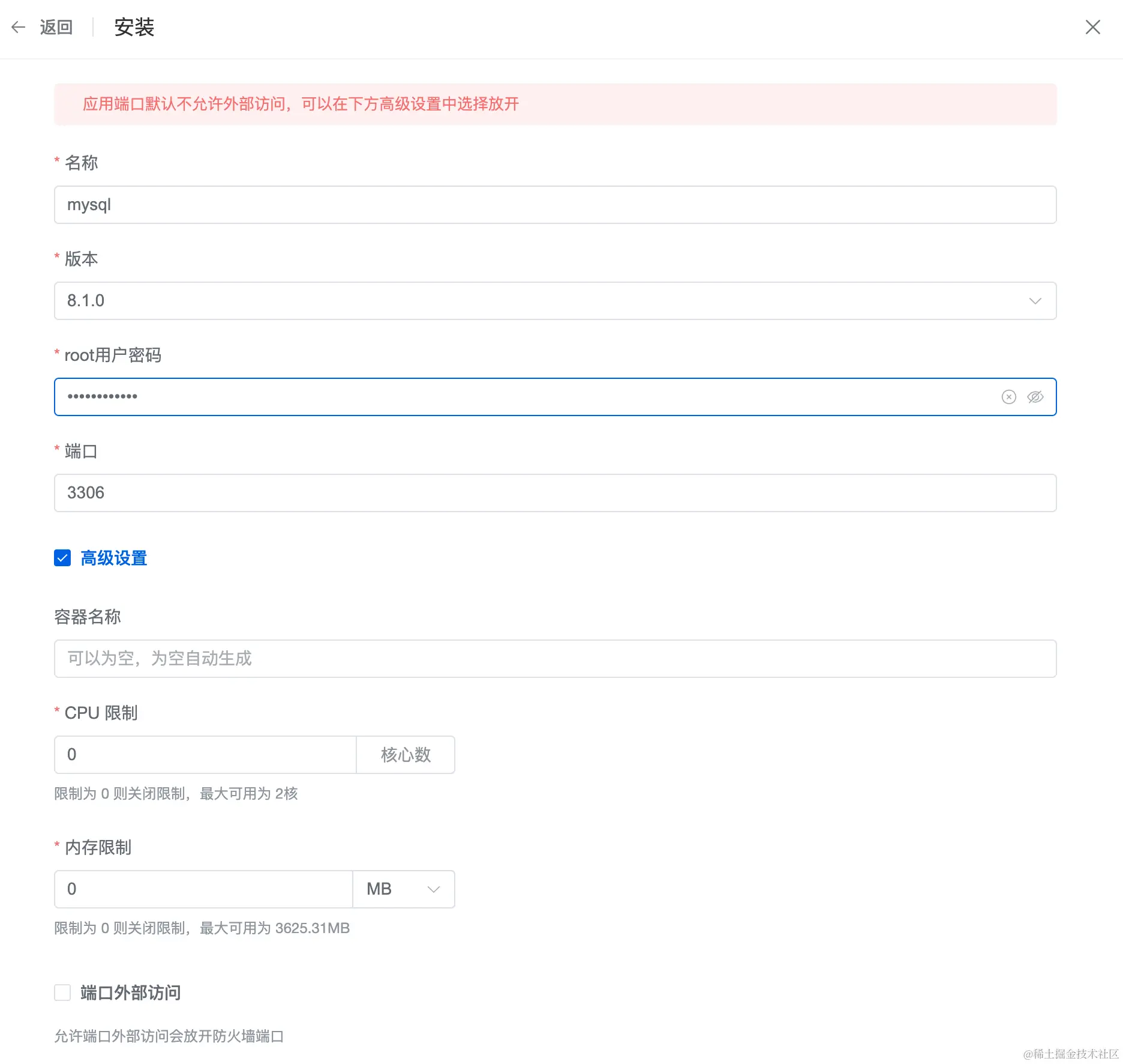 在弹出的面板中,简单配置用户密码即可。无需勾选端口外部访问, 阿里云开启端口外部访问是通过配置安全组操作的,参见这里.