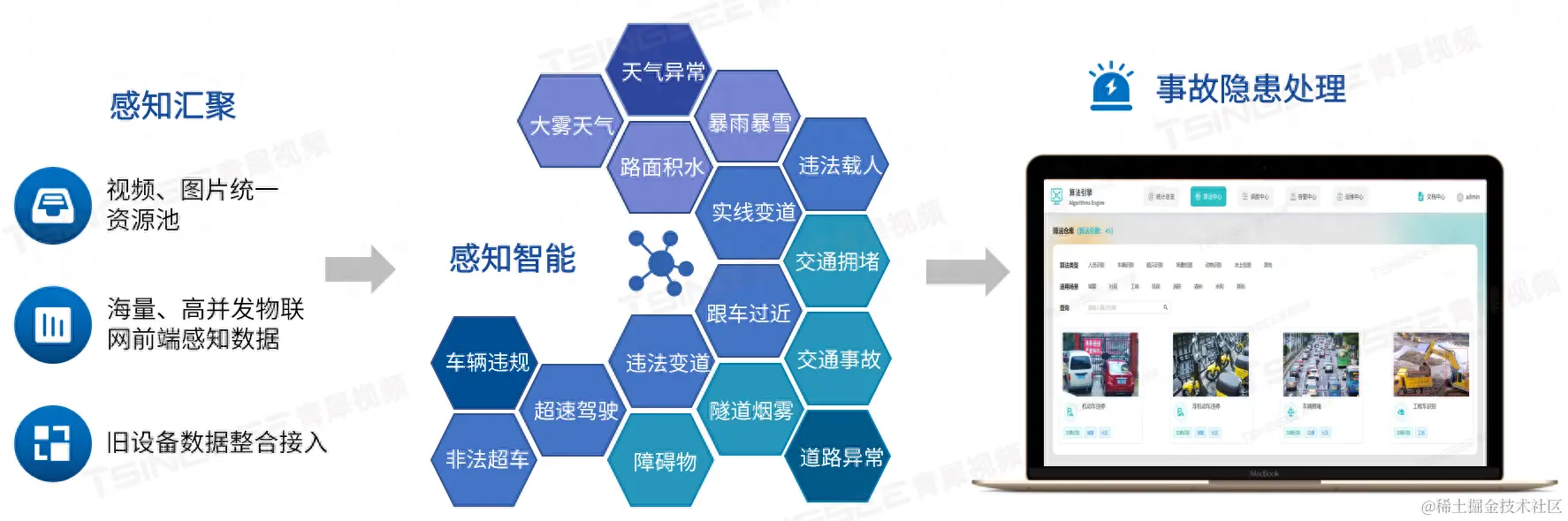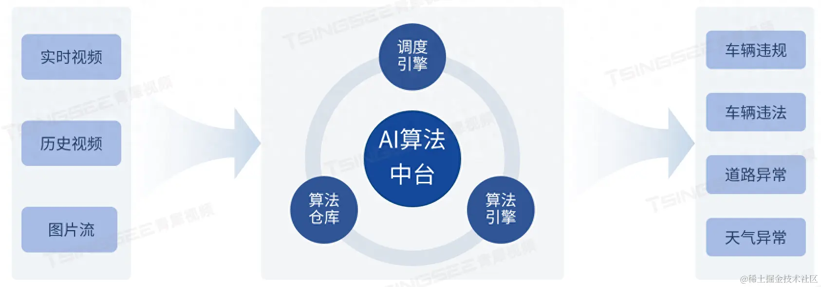 多场景感知智能分析算法通过AI算法中台进行统一处理。AI算法中台由算法仓库、算法引擎和调度引擎三部分组成,通过调度引擎对输入的各类视频图像数据按需进行算法配置与计算,输出价值信息为各场景应用。