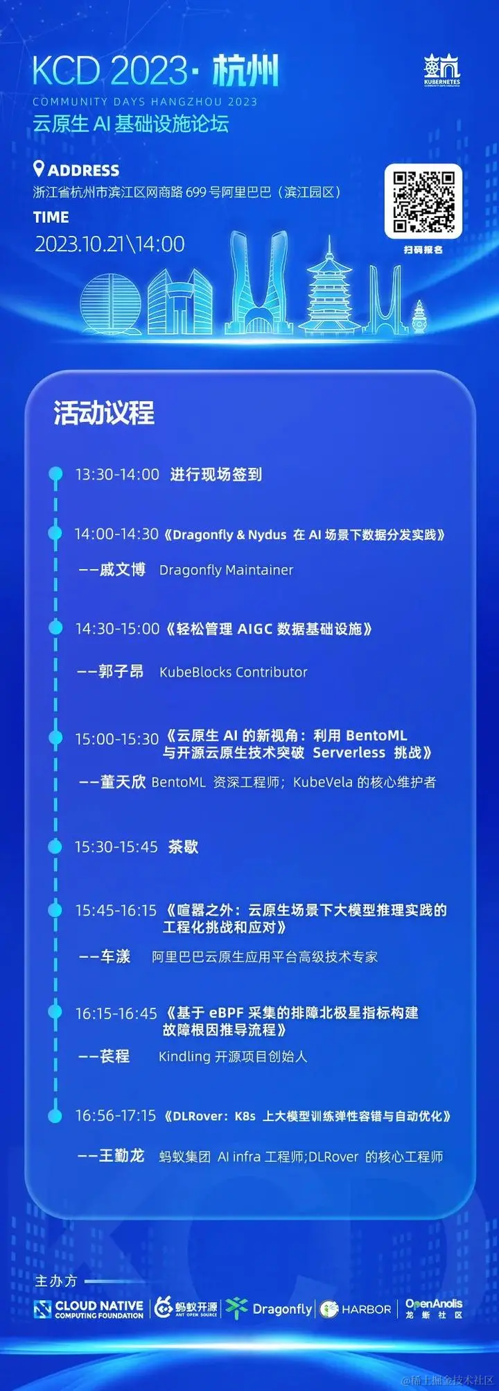 本次也是 Kubernetes Community Days 首次来到杭州,由 CNCF、蚂蚁开源、龙蜥社区、Dragonfly 社区、Harbor 社区联合发起。希望能够在这座充满活力的城市进一步推广云原生相关技术。