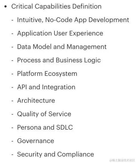 Gartner在2020年9月发布的《企业级低代码开发平台的关键能力报告》(Critical Capabilities for Enterprise Low-Code Application Platforms)中,列举了低代码的11项关键能力。