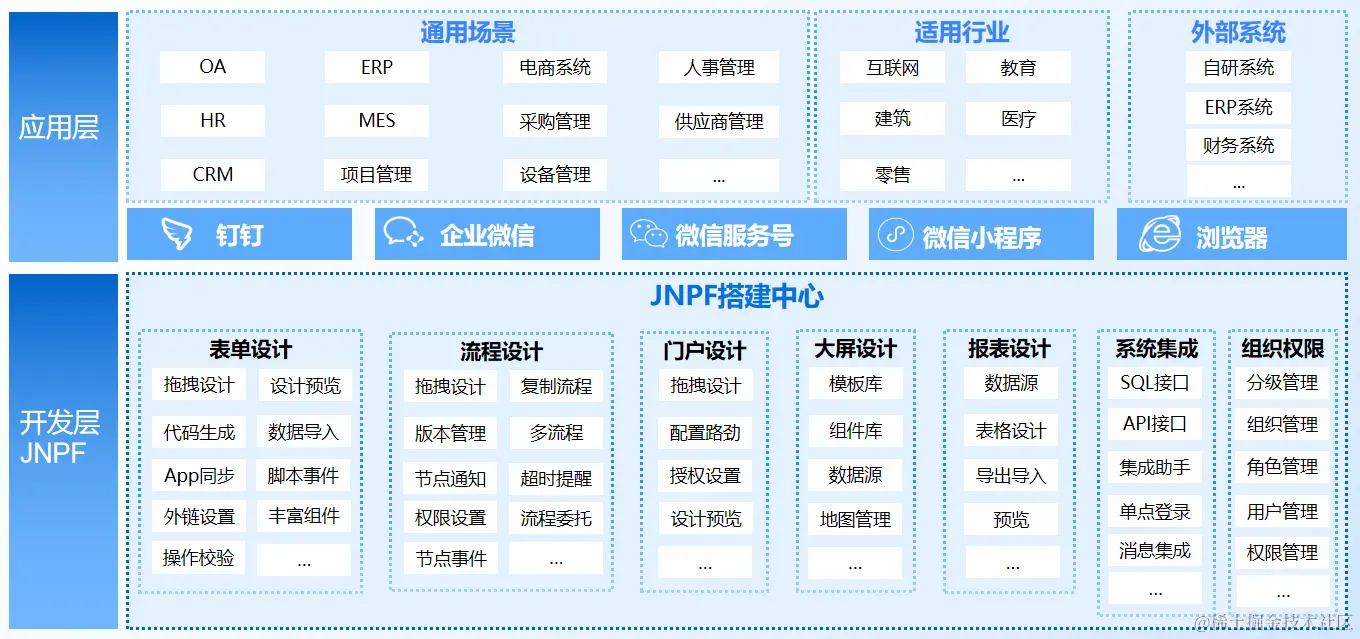 以国内主流低代码开发平台JNPF为例。该平台提供开箱即用的开发组件,同时为系统的各个分层均提供编程扩展能力,以满足企业级应用开发对扩展性的高要求。借助分层编程接口,开发者可以用纯代码的方式实现新增功能,无需受限于低代码开发平台的版本和现有功能。**况且JNPF提供全源码,这将更有利于开发者操作。
