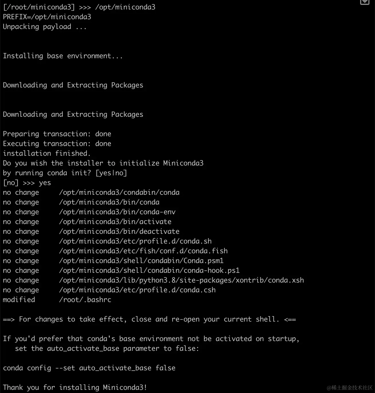选择安装路径为 /opt/miniconda3, 如下图所示,完成安装。