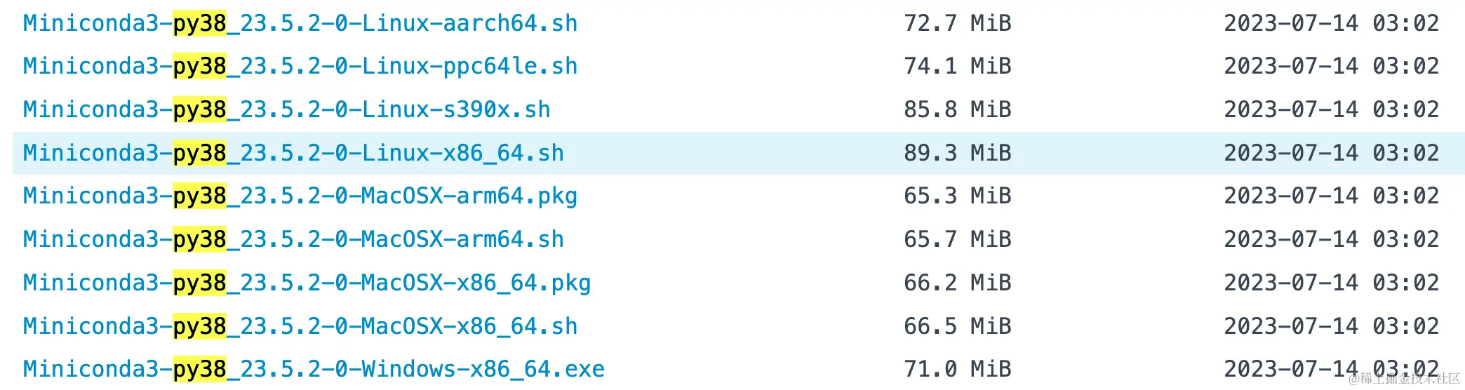 下载 Miniconda 3, 下载对应的版本,这里选择 Miniconda3-py38_23.5.2-0-Linux-x86_64.sh.
