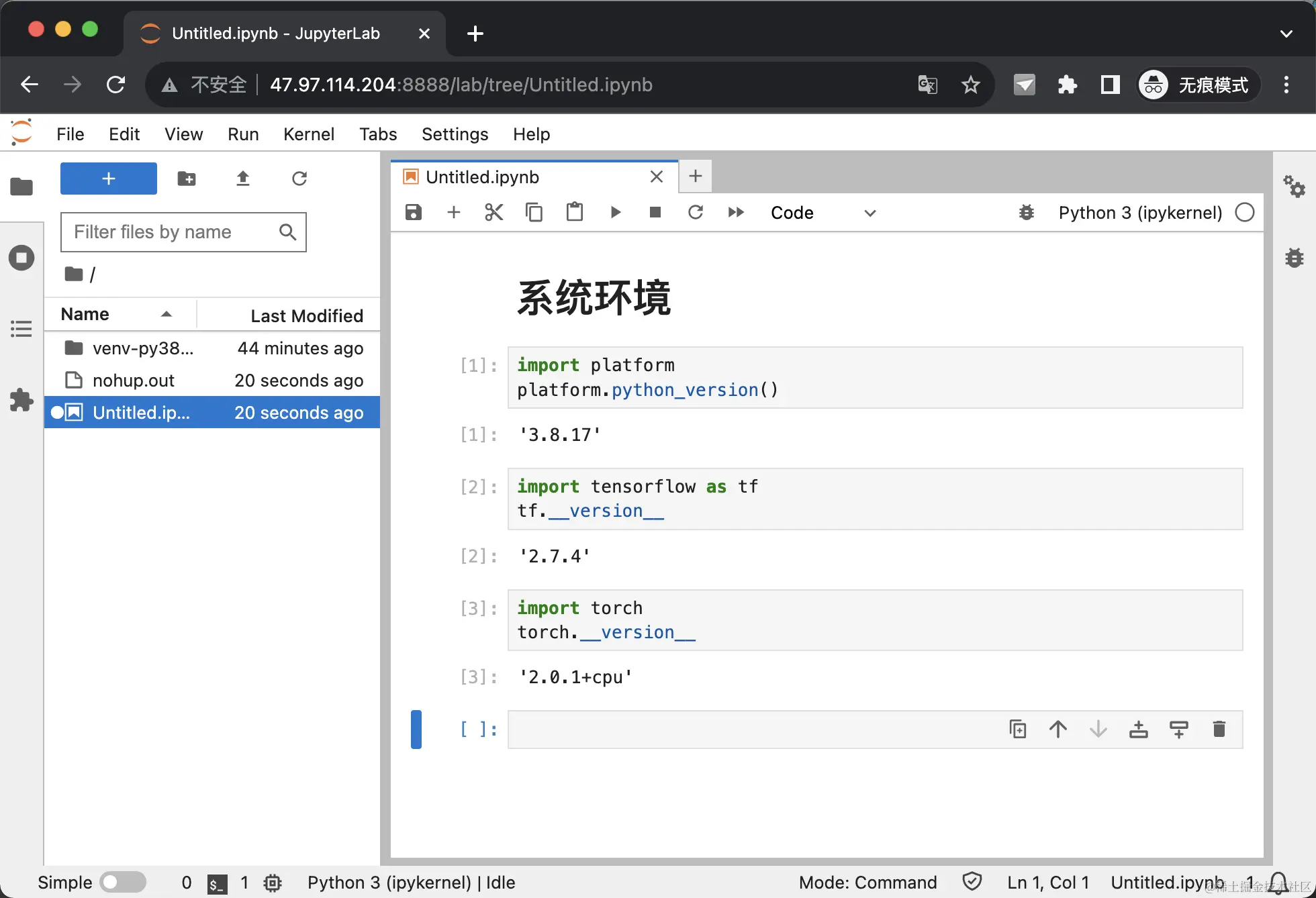 本文介绍在云服务器上,安装 Python 3.8, 并部署 JupyterLab 4, 打造个人 Web IDE. 适用于数据分析、数据挖掘、机器学习的同学,你将方便地随时随地使用计算资源。