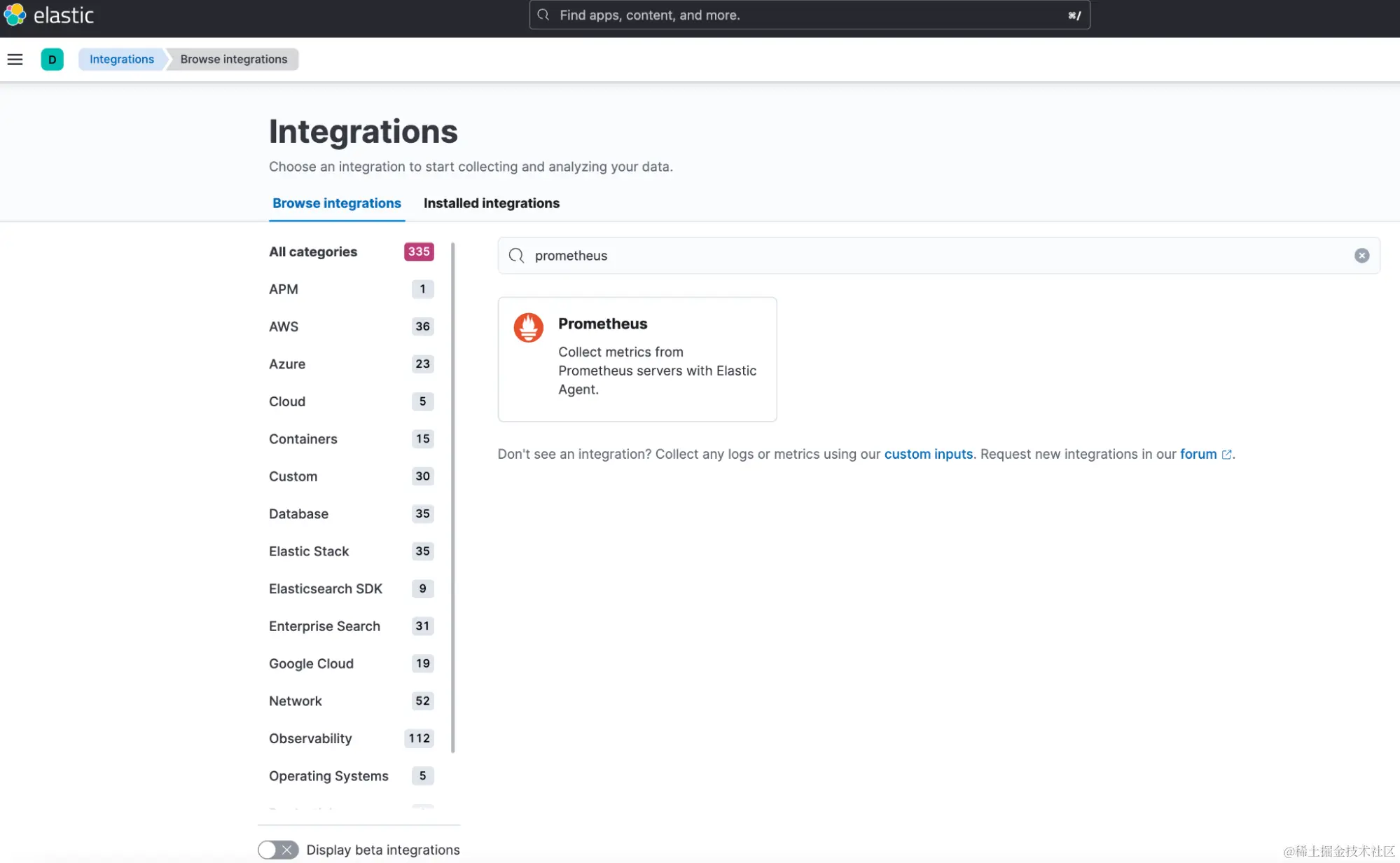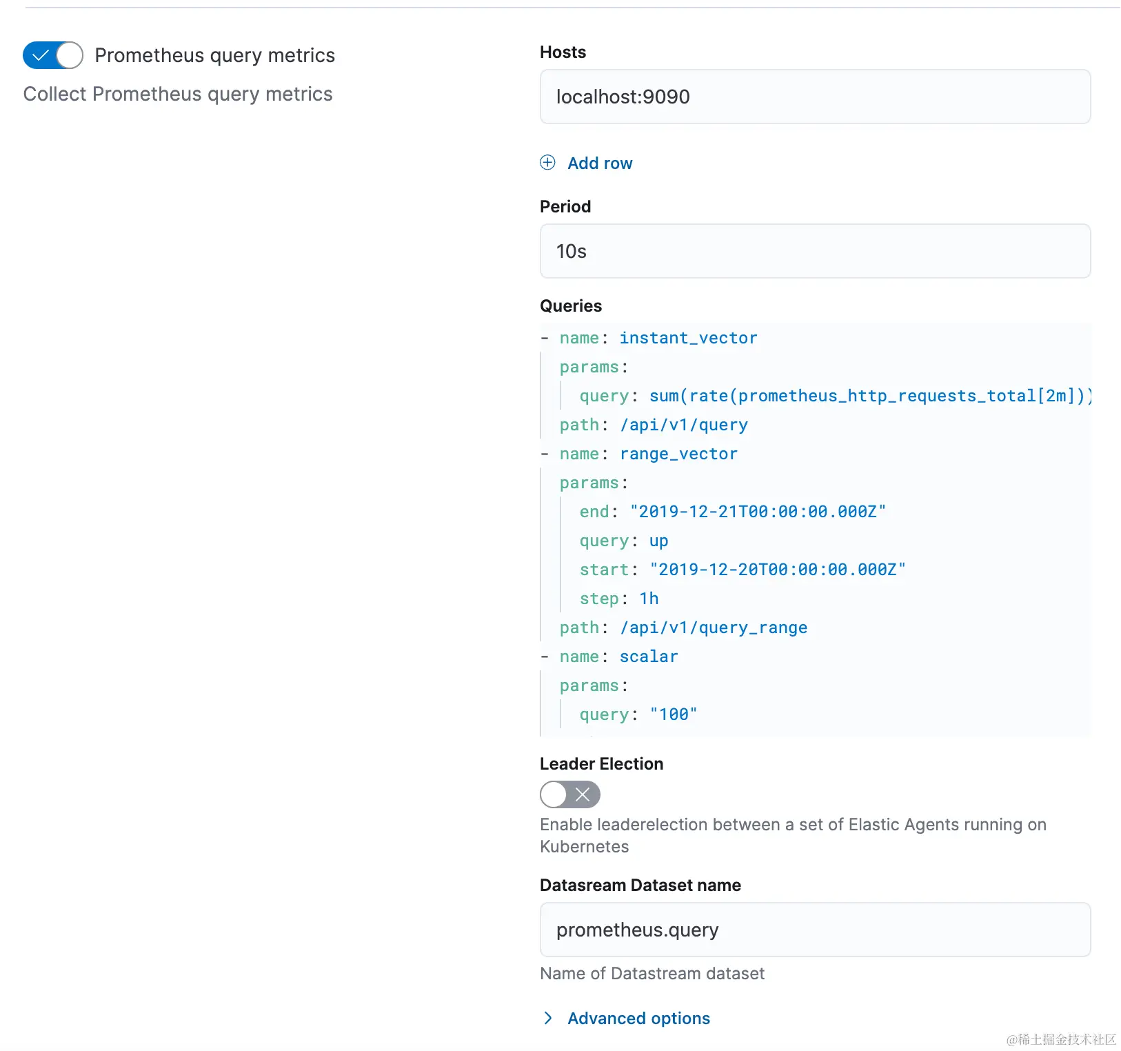 为了从 Prometheus 服务器收集指标,使用了 Elastic Agent,并通过 Fleet 服务器对 Elastic 代理进行集中管理。