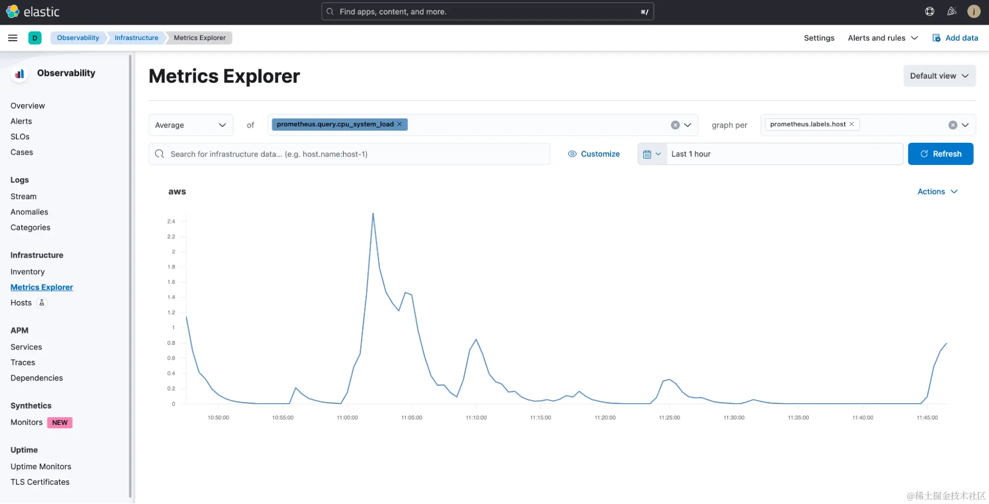 Elastic Lens 使用户能够通过动态可视化直观地探索和可视化数据。 这种用户友好的界面消除了对复杂查询语言的需求,使更广泛的受众可以进行数据分析。 Elasticsearch 还提供其他强大的可视化方法,包括聚合和过滤器,使用户能够对其 Prometheus 指标数据(包括短期和历史数据)执行高级分析。 要了解更多信息,请查看操作方法系列:Kibana。