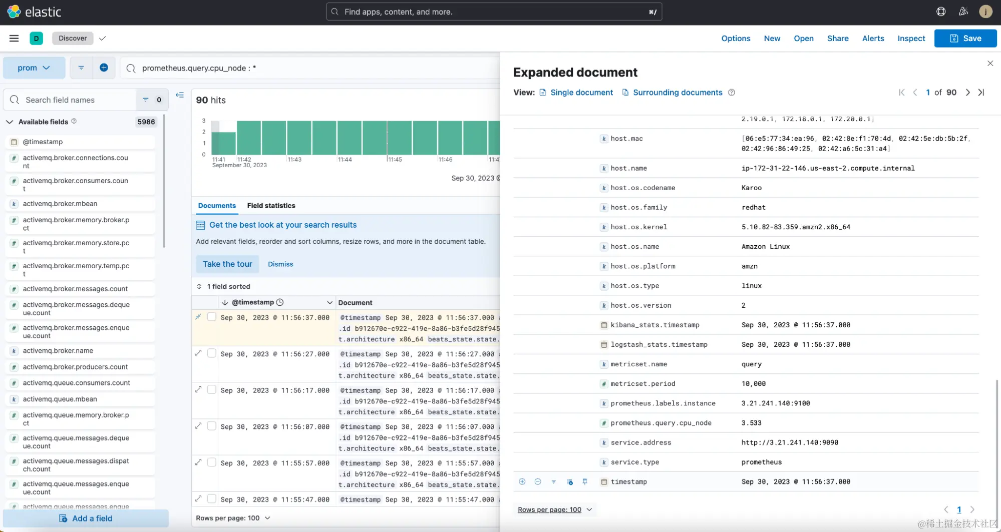 你还可以在 Discover 中查询指标数据,并在详细信息面板中浏览各个文档的字段。
