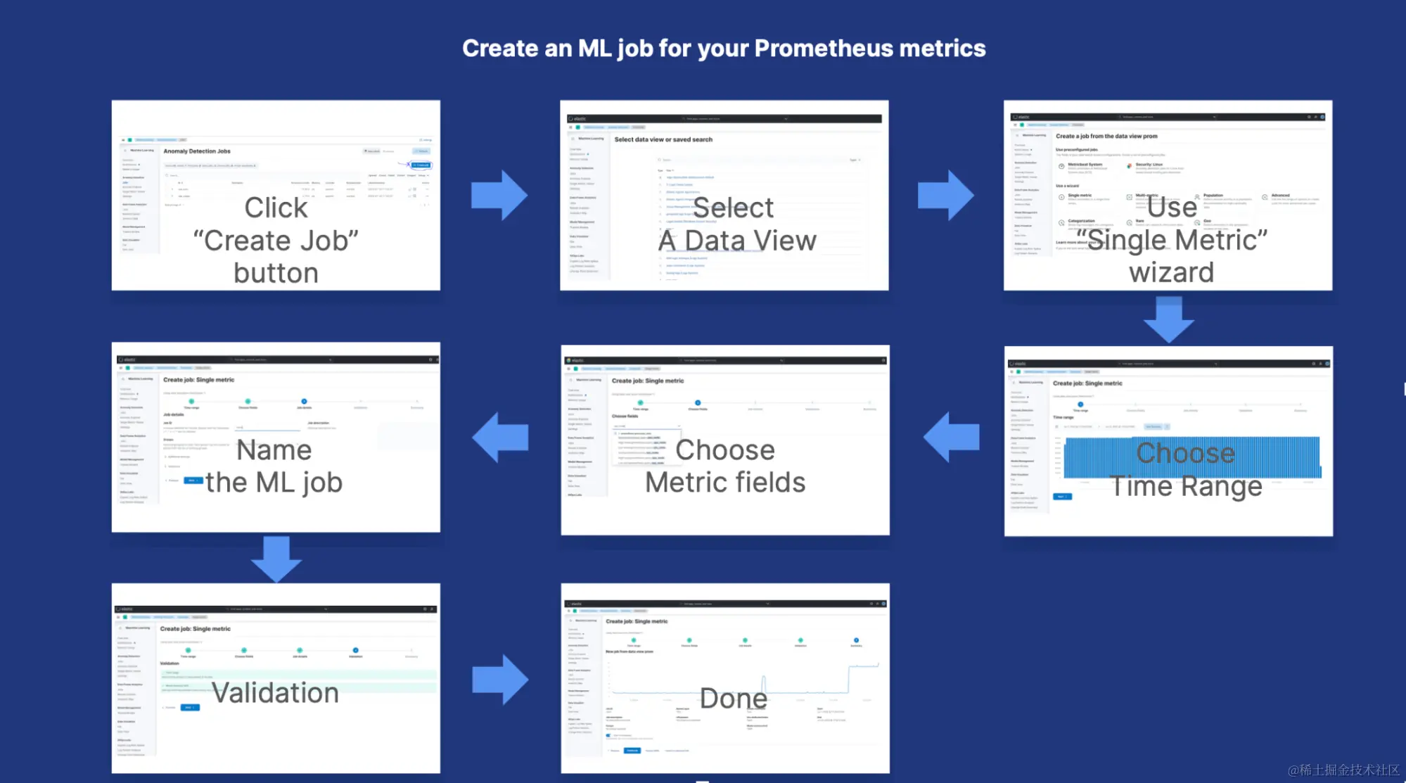 为 Prometheus 数据创建机器学习作业是一项简单的任务,只需几个简单的步骤。 只需在单一指标视图中指定数据索引并设置所需的时间范围即可。 然后,机器学习作业将自动处理历史数据,在幕后构建统计模型。 这些模型将使系统能够有效地预测趋势并识别异常情况,为你的监控需求提供有价值且可操作的见解。