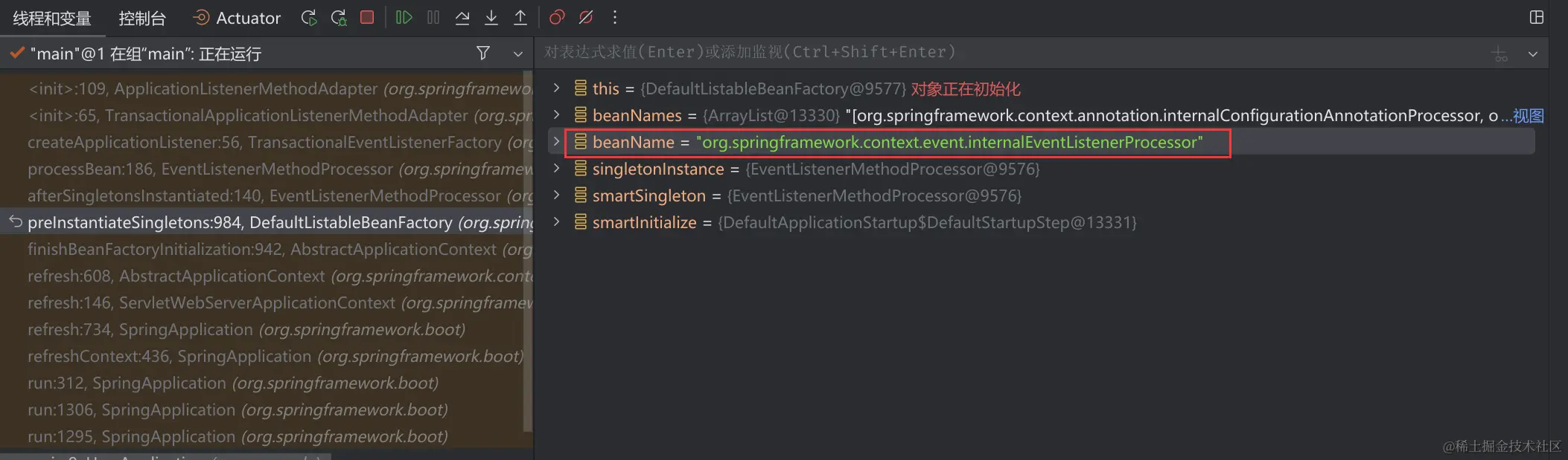 可以看到,从 main 方法,一直到容器刷新的finishBeanFactoryInitialization(beanFactory)调用处,这是 Spring 实例和初始化所有非懒加载单例 bean 的地方,继续跟进,在finishBeanFactoryInitialization(beanFactory)方法的最后,真正进行 bean 的实例和初始化