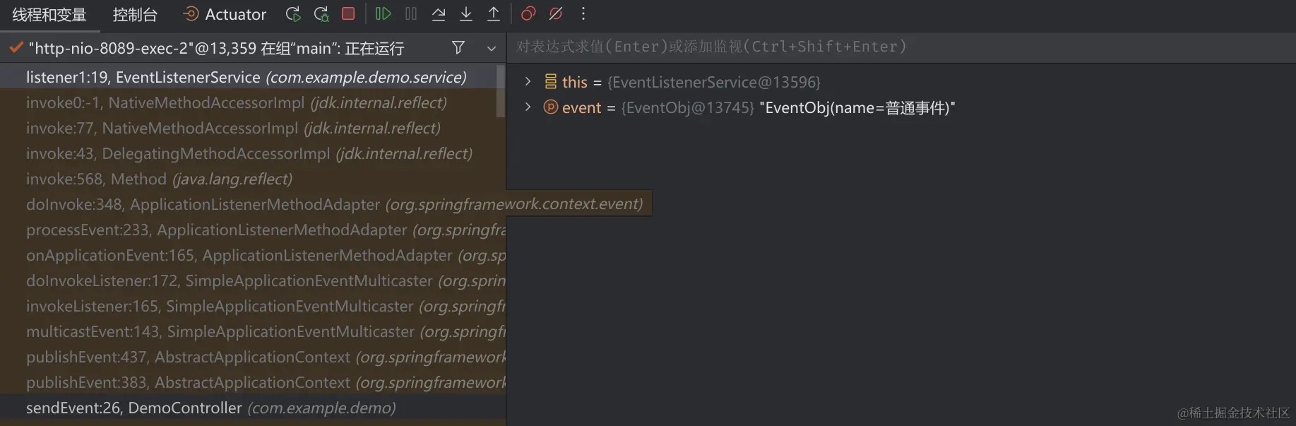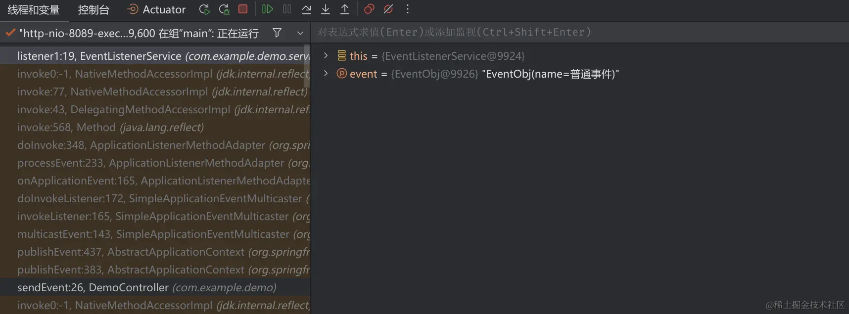 Spring 的源码繁多,想要准确的找到某个功能在源码层面中的具体位置也许并不简单,但我们可以根据功能的使用情况,在应用层面打上断点,比如这里的事件发布,我们可以在listener1方法接收事件对象的地方打上断点,再通过调用堆栈查看源码到底是怎样的调用流程,如下