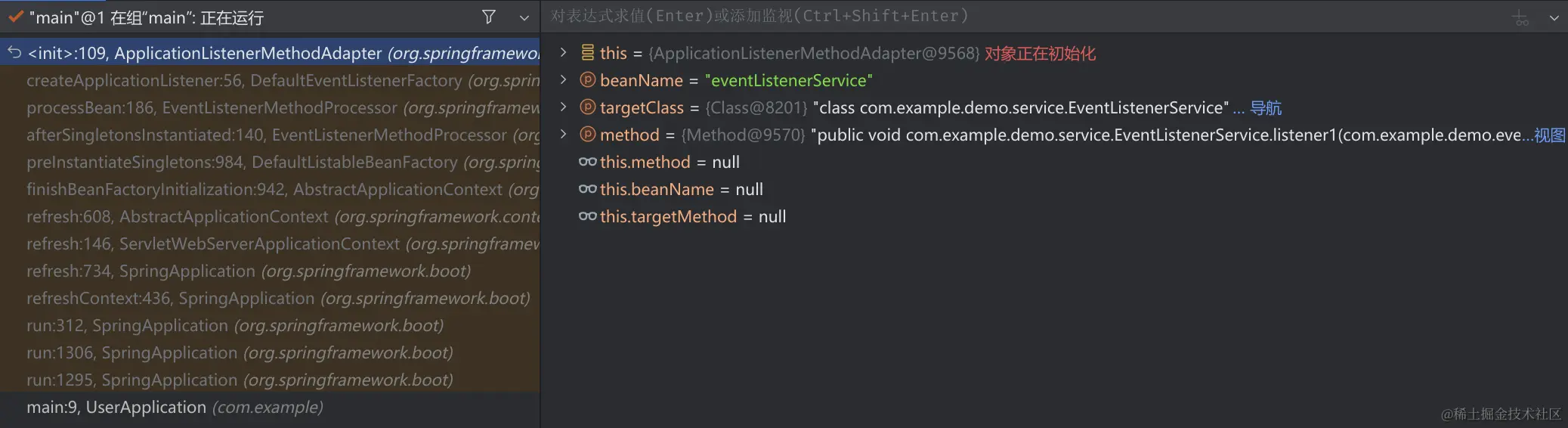那么只需要将断点打在ApplicationListenerMethodAdapter的构造方法,就可以探究这种绑定关系是怎样建立的,由此我们可以得到如下调用栈