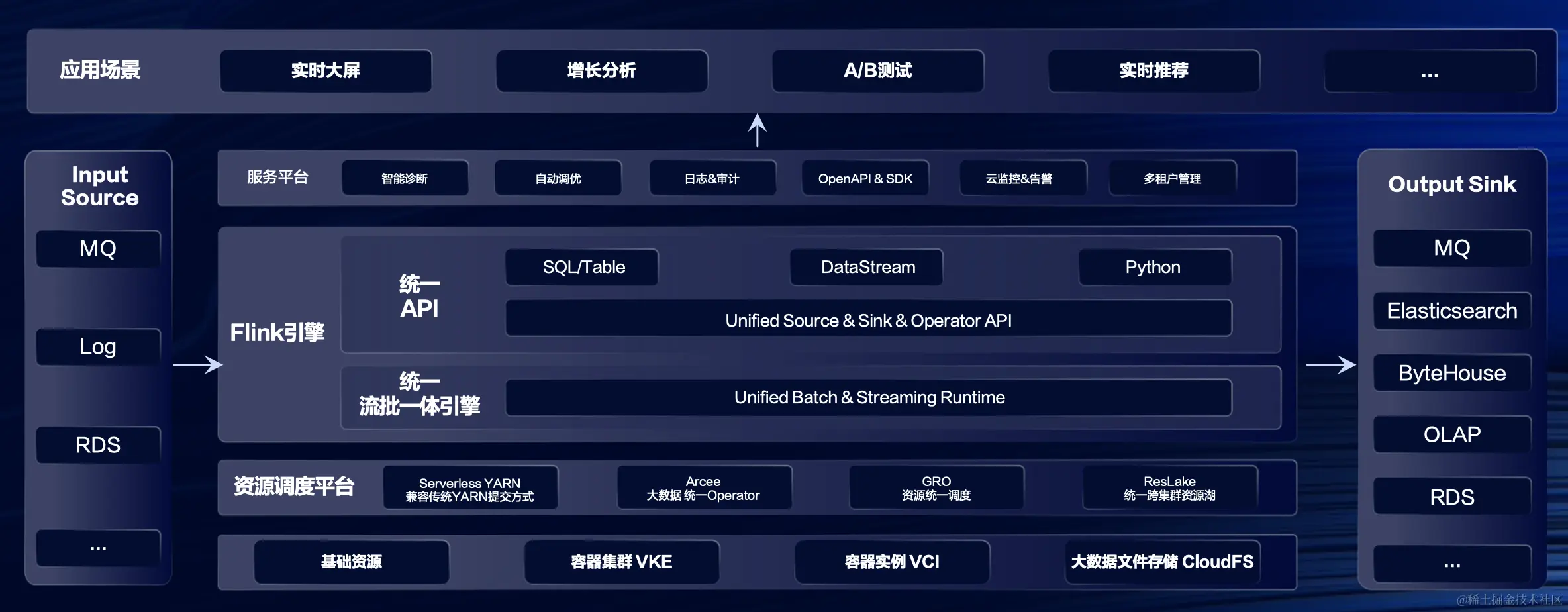 在字节,这款产品被称为“Serverless Flink”。Serverless Flink 依托于字节跳动在业内最大规模实时计算集群实践,基于火山引擎容器服务(VKE/VCI),提供 Serverless 极致弹性,是开箱即用的新一代云原生全托管实时计算平台。