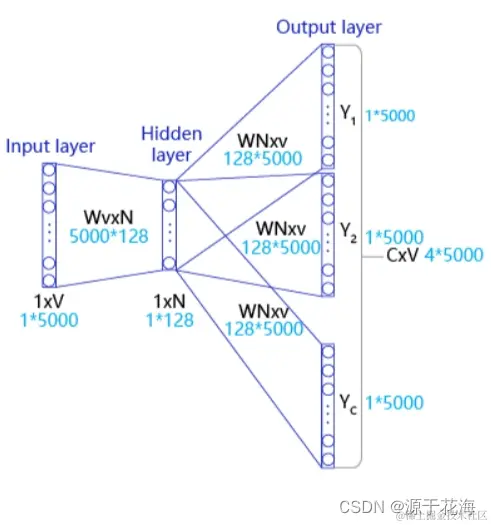 - Output Layer(输出层): 将隐藏层的结果乘以另一个 word embedding 张量 ,得到一个形状为 的张量。这个张量经过 softmax 变换后,就得到了使用当前中心词对上下文的预测结果。根据这个 softmax 的结果,我们就可以去训练词向量模型。