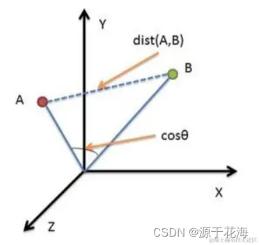 如下图所示,欧式距离 表示词向量的空间距离,余弦 显示词向量在方向上的差距。