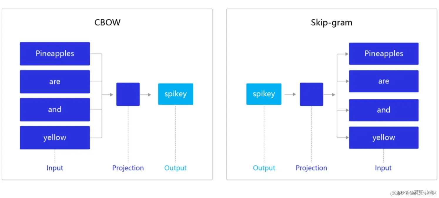 word2vec 包含两个经典模型,CBOW(Continuous Bag-of-Words)和 Skip-gram,如 图2 所示。