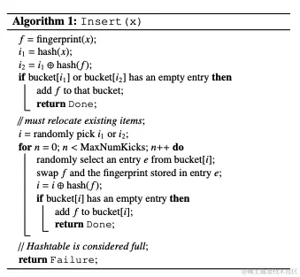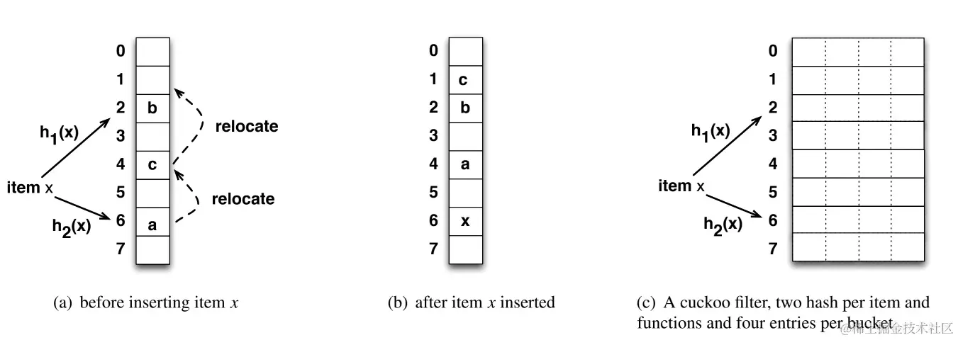 即计算出来两个桶的索引,其中第一个桶的索引是通过某个哈希函数计算出来,第二个是使用第一个索引和指纹的哈希做了一个异或操作,进行异或操作的好处是,因为异或操作的特性:同为0不同为1,且0和任何数异或是这个数的本身。那么也可以通过和指纹异或来计算。 换句话说,在桶中迁走一个键,我们直接用当前桶的索引和存储在桶中的指纹计算它的备用桶。