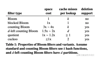 注:k随机哈希函数个数 d-left countfilter bloom filters 有d 个分区;