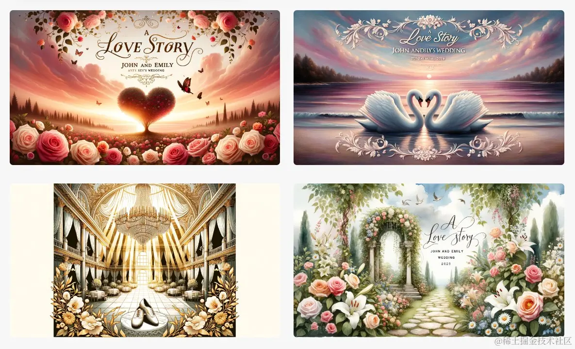 举例: Design visually striking banners for a romantic wedding. Incorporate elements that represent love and elegance and prominently display the text "A Love Story: John and Emily's Wedding". Ensure a balanced composition suitable for both online and physical display.