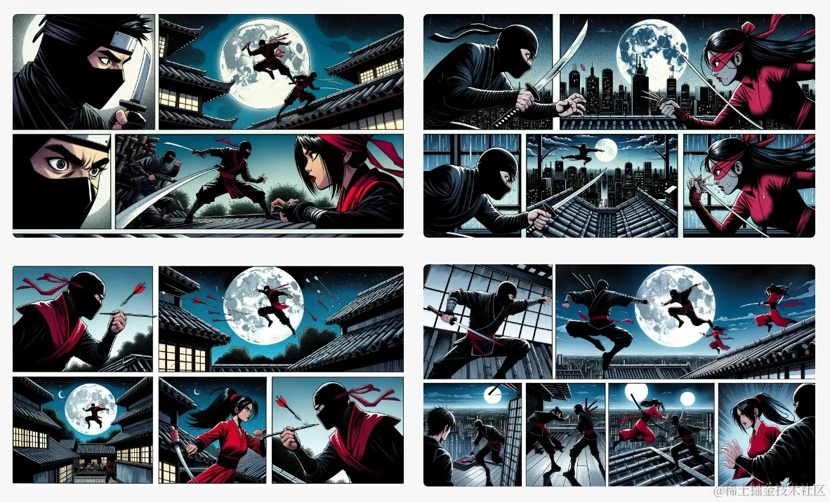 举例: Illustrate dynamic comic strips with stealthy ninja and a rival ninja clan member, depicting a scene or event where they engage in a high-stakes duel on moonlit rooftops.