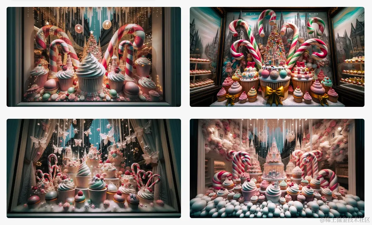 Example: Eye-catching wide photos of window displays for a gourmet bakery with a whimsical fairytale motif, featuring oversized cupcakes and candy canes and evoking a feeling of childlike wonder and delight.