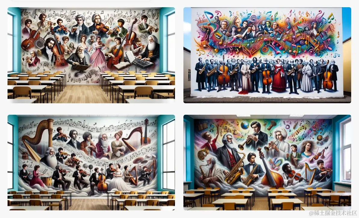 举例: Wide wall murals for a music classroom depicting composers and instruments, incorporating elements that convey harmony and creativity. The mural should blend harmoniously with the surroundings.