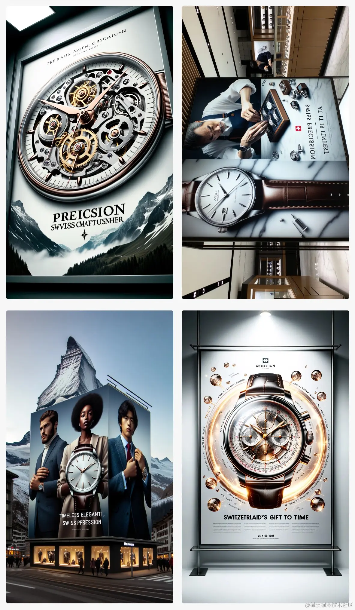举例: Design impactful advertisement posters for a luxury watch, emphasizing its precision Swiss craftsmanship. (Tall)