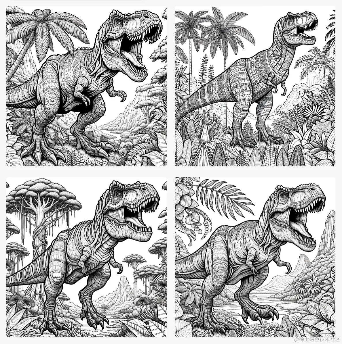 Example: Design detailed coloring book pages featuring prehistoric dinosaurs, with clear outlines and patterns that allow for creative coloring and shading. The scene should be lively, highlighting a fierce Tyrannosaurus Rex and lush Jurassic vegetation.