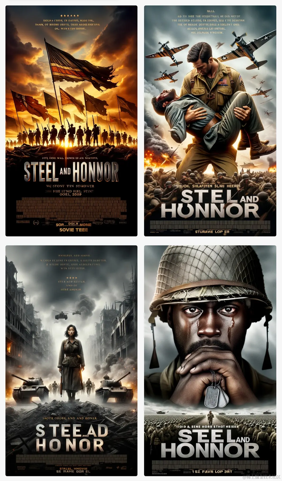举例: Craft captivating movie posters for a war film named ‘Steel and Honor’, hinting at the valor and sacrifice of soldiers on the battlefield. (Tall)