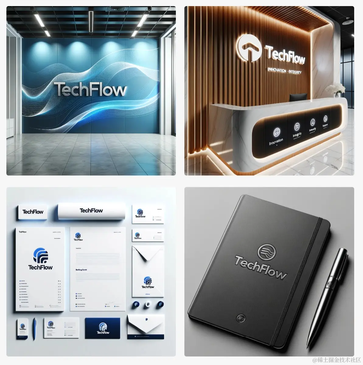 举例: Design a cohesive office branding set for a tech startup named “TechFlow”, reflecting a modern and innovative ambiance. The set should include wall murals, reception desk branding, and stationery items, emphasizing the company's core values and identity.