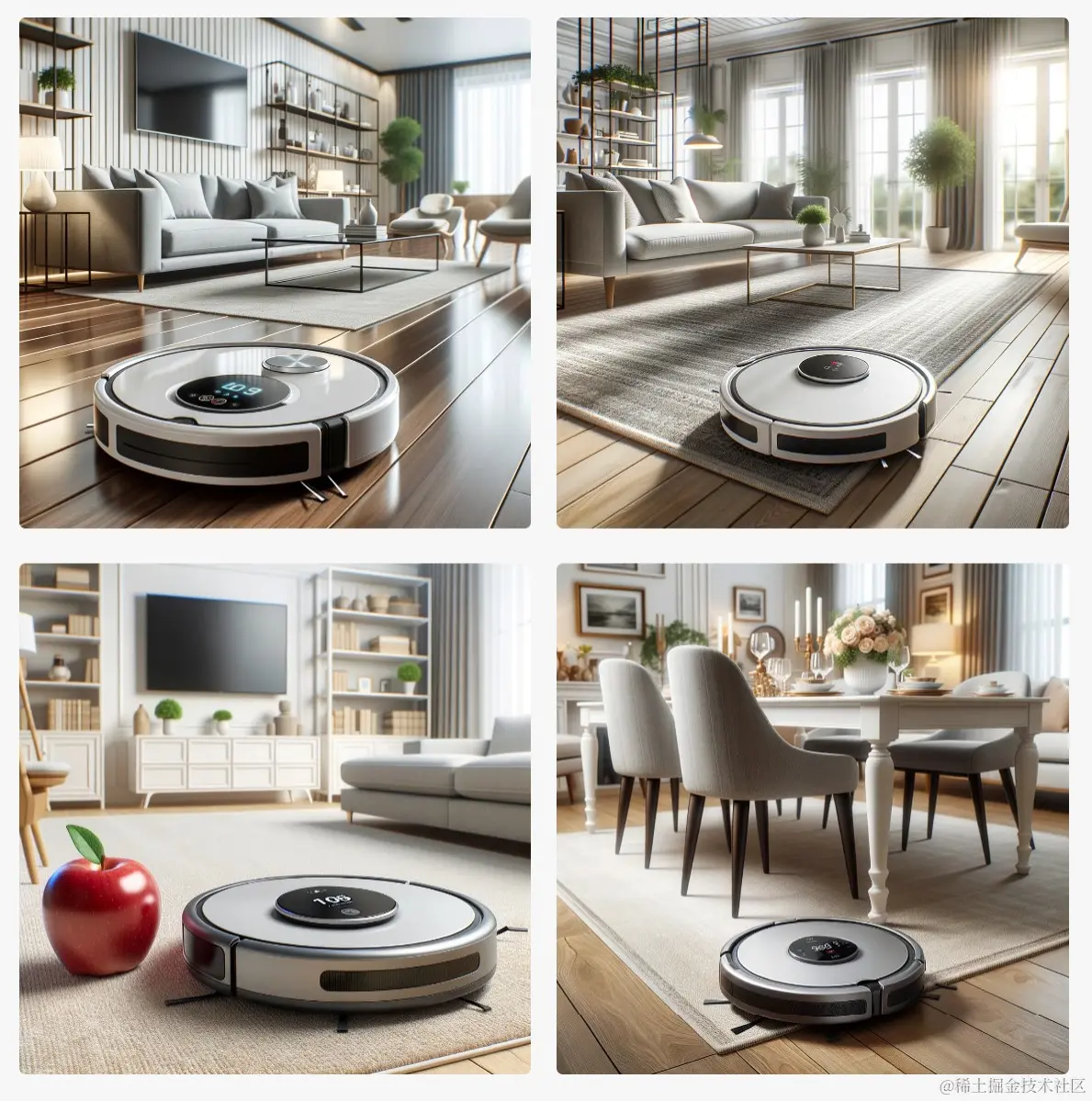 举例: Create realistic product mockups for a robotic vacuum cleaner named CleanBot X, showcasing its slim design and smart navigation technology, set against a clean and tidy living room.