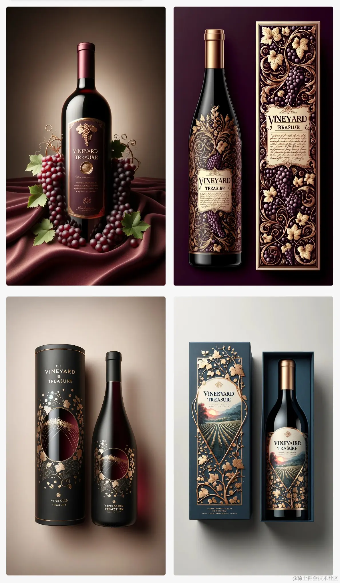 举例: Design visually appealing product packaging for a wine named "Vineyard Treasure", incorporating elements that represent elegance, luxury, and the rich heritage of vineyards.